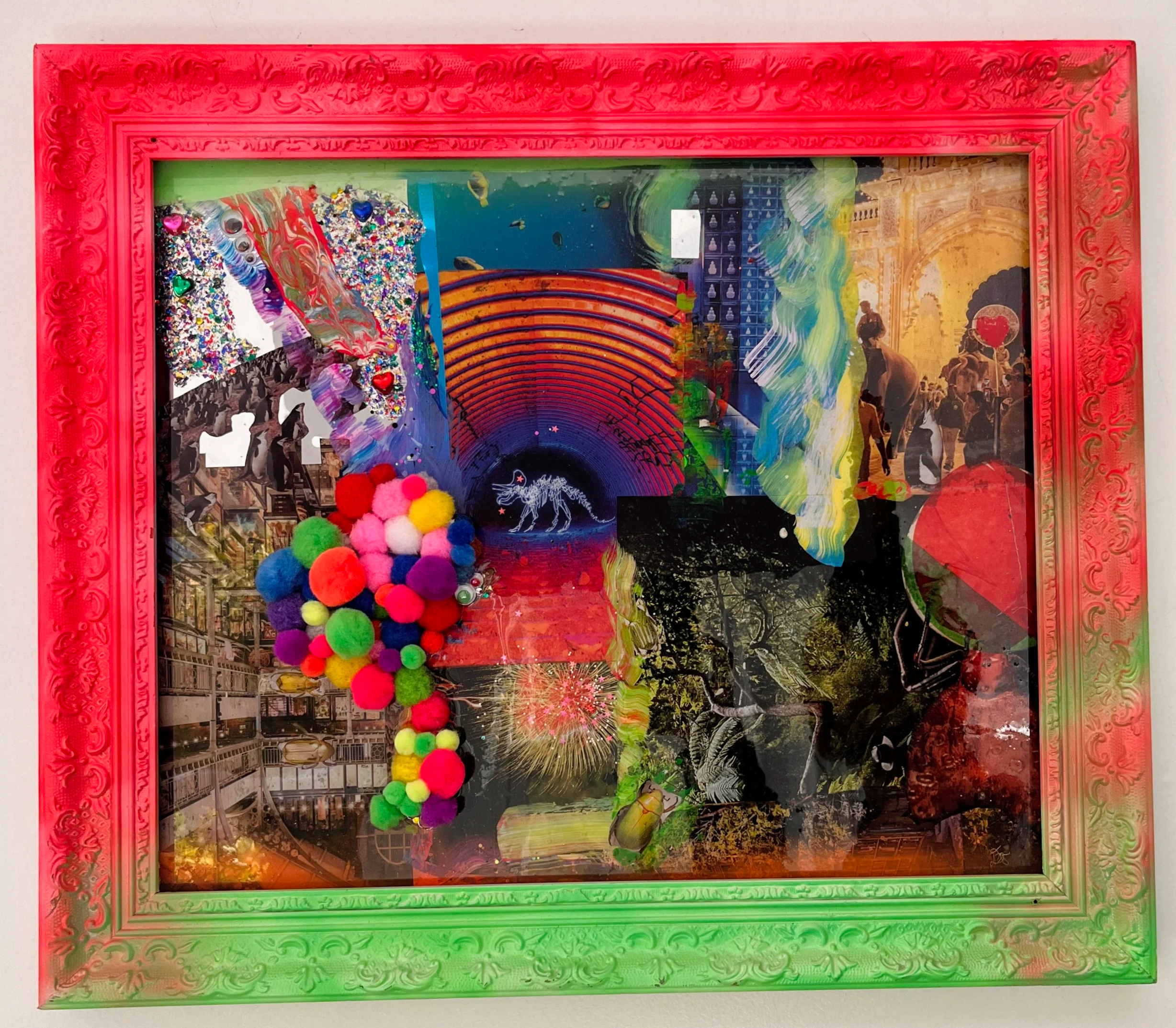 Plastic, glitter, pom-poms, mirror, tissue, acrylic, recycled paper resined on mounted wood.