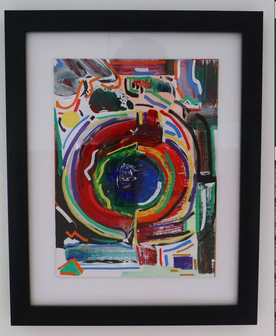 12 in x 15 in (including frame)Acrylic, graffiti paint and pastel on canvas board $225 Into the slip Make Inquiry