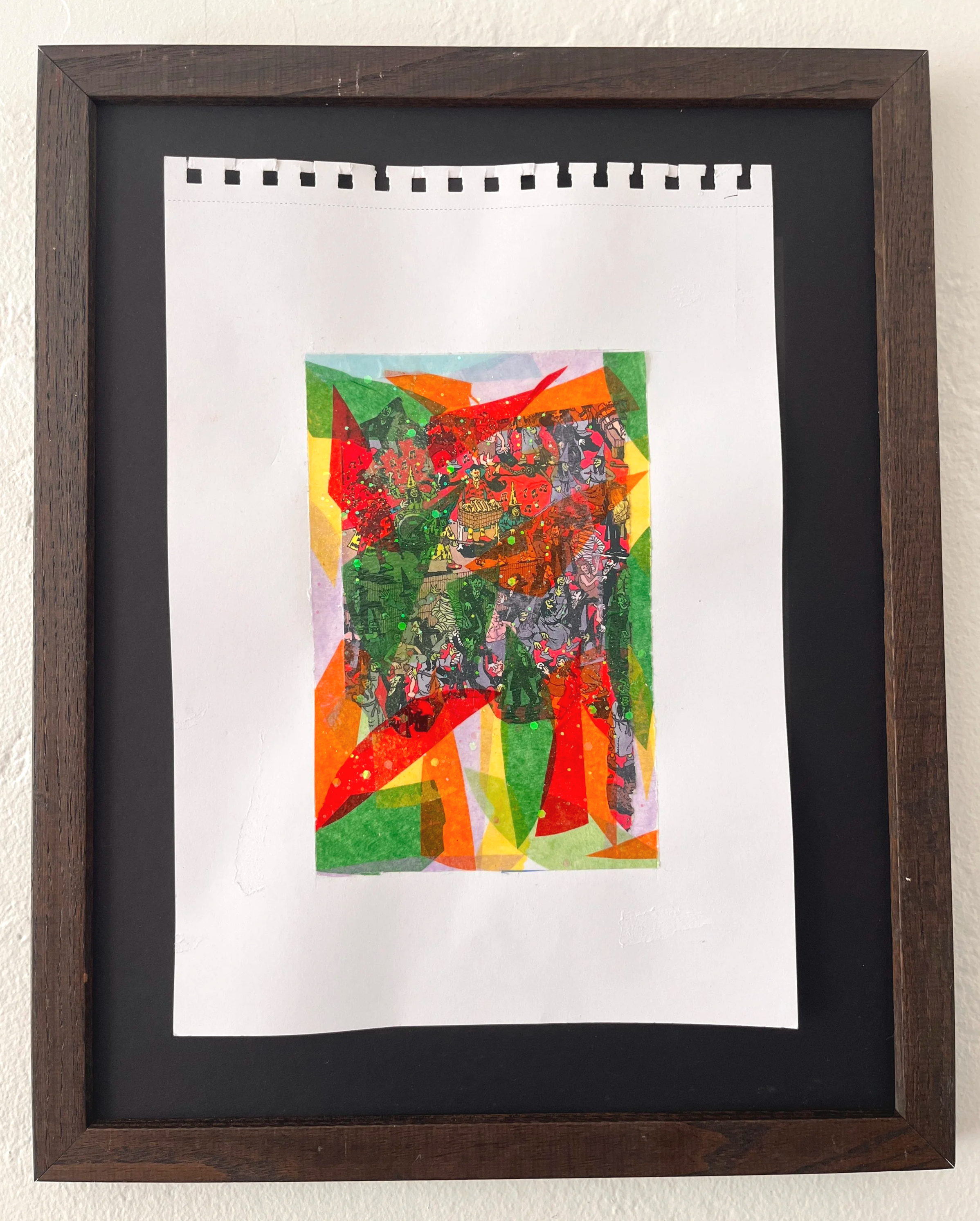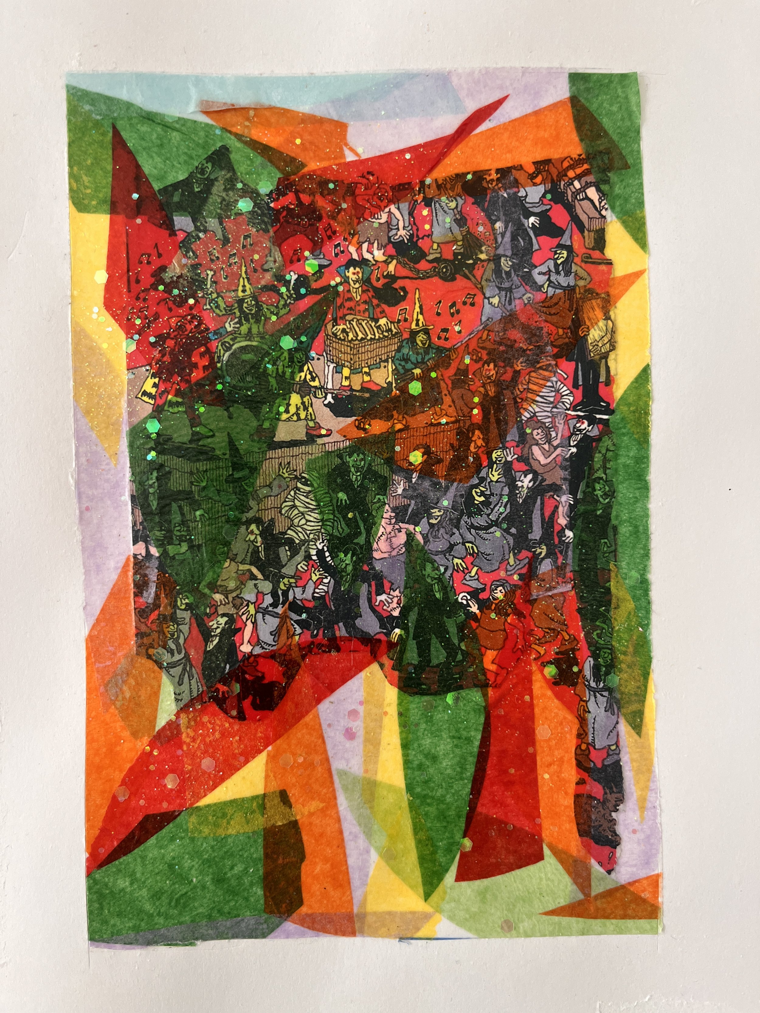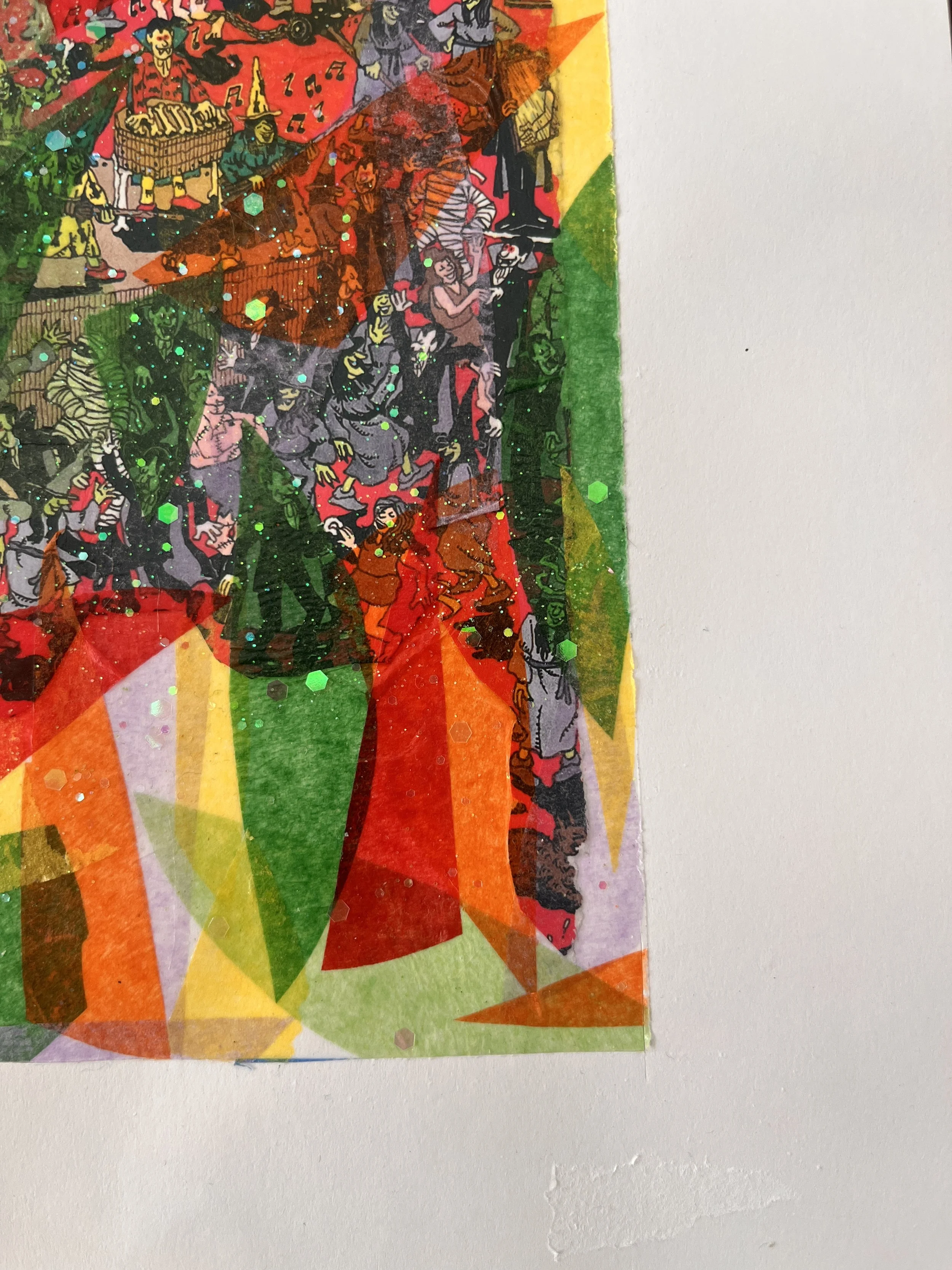 Tissue paper, collage & glitter on paper